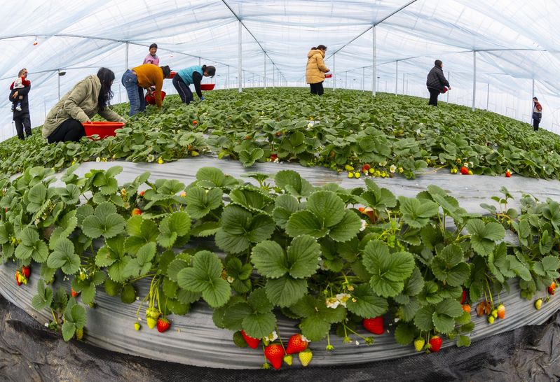 “這里的草莓大棚好大啊,剛拉開(kāi)大棚門(mén)香味就撲面而來(lái)了,我去過(guò)很多草莓大棚,這么大這么高的還是第一次見(jiàn),今天真是長(zhǎng)見(jiàn)識(shí)了?!闭f(shuō)此話的是盱眙鄉(xiāng)村紅色主播張麗麗,張麗麗擁有100多萬(wàn)粉絲,在看到三河農(nóng)場(chǎng)直播間后,跟隨航拍視頻來(lái)到了三河農(nóng)場(chǎng)農(nóng)業(yè)科技示范園,并在大棚里進(jìn)行了現(xiàn)場(chǎng)直播,一時(shí)間使三河農(nóng)場(chǎng)的團(tuán)購(gòu)鮮果草莓采摘“走火”盱眙周邊,慕名前往三河體驗(yàn)采摘樂(lè)趣的游客絡(luò)繹不絕。家住盱眙縣城的游客高露震說(shuō),“我是特意星期六下午來(lái)采摘的,因?yàn)楹⒆酉肟纯茨銈兪窃趺粗辈サ模f(shuō)要看看直播的阿姨和叔叔,今天總算是見(jiàn)到真人了,孩子們不僅吃到了草莓,還見(jiàn)到了你們,開(kāi)心的不得了?!薄拔沂窍挛缢⒍兑艨吹饺愚r(nóng)場(chǎng)的直播間,然后就開(kāi)車(chē)從淮安過(guò)來(lái)了,早就聽(tīng)說(shuō)三河農(nóng)場(chǎng)的草莓特別好吃,今天到這里一看果然震撼,這么大的草莓大棚還真是第一次看見(jiàn),一個(gè)大棚里能吃到好幾個(gè)品種不同口味的草莓,這也是第一次體驗(yàn),春節(jié)放假,我還會(huì)帶著老人和孩子來(lái)采摘?!眮?lái)自淮安市區(qū)的張先生高興的說(shuō)。時(shí)下正是寒冬臘月,室外溫度達(dá)到了零度以下,但走進(jìn)三河農(nóng)場(chǎng)農(nóng)業(yè)科技示范園的草莓溫室大棚里卻溫暖如春,只見(jiàn)大棚里一片綠郁蔥蔥,肥厚翠綠的草莓葉間夾著朵朵白色的小花,綠
