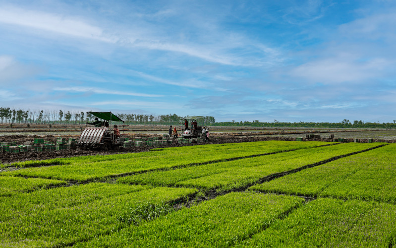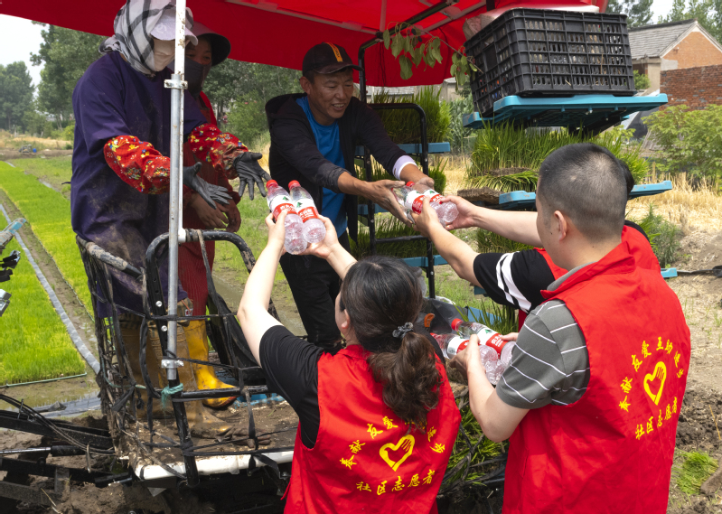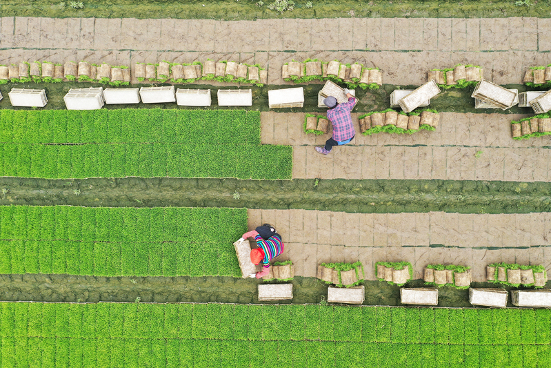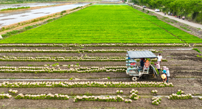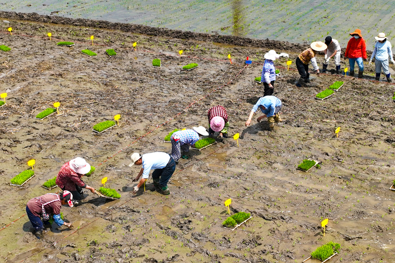 端午假期第一天,蘇墾農(nóng)發(fā)南通分公司3大隊田頭一片忙碌景象。烈日下,7位農(nóng)技人員彎著腰在水稻田一字排開移栽秧苗,腳下步履維艱、鼻頭汗珠滴落。按照隊伍兩頭農(nóng)技人員手拉的直線,他們小心翼翼地從秧盤上取下秧苗,左手握苗,右手插秧,確保行距25厘米,株距20厘米,每穴2株,橫豎成線、深度適中。每隔一段距離,田間都會插上一塊寫明實驗數(shù)據(jù)的標簽。“不同的標簽對應(yīng)了不同的試驗稻種。人工插秧可以確保水稻增產(chǎn)試驗的科學(xué)性、嚴謹性、準確性?!碧K墾農(nóng)發(fā)南通分公司農(nóng)業(yè)中心主任趙中華表示。今年,蘇墾農(nóng)發(fā)南通分公司大力推進農(nóng)業(yè)科技創(chuàng)新,與南通大學(xué)生命科學(xué)學(xué)院合作開展水稻高產(chǎn)技術(shù)研發(fā),為南通稻米產(chǎn)業(yè)供給性結(jié)構(gòu)優(yōu)化、品質(zhì)提升、節(jié)本增效和綠色高產(chǎn)提供技術(shù)支撐。前期,校企雙方分別對南粳46、南粳5055稻種以微波、離心、超聲波等3種方式,按時間長度各進行32種處理。落谷前,蘇墾農(nóng)發(fā)南通分公司對不同品種、不同處理的水稻種子提前進行了篩選、收集、稱重、貼標、裝袋等準備工作,同時與相關(guān)農(nóng)業(yè)大隊溝通協(xié)調(diào)好浸種催芽時間,在種子露白后及時安排工人與農(nóng)機,掌握好落谷的最佳時機與最優(yōu)質(zhì)量,控制種子秧盤播撒的均勻度,精準把控好土壤濕度與精細
