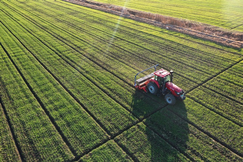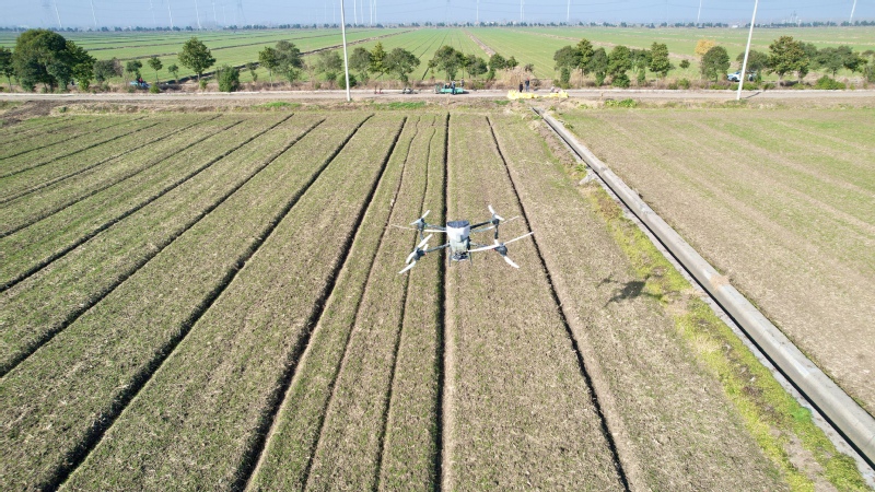 當前,正是小麥冬季管理的重要時期,連日來,蘇墾農(nóng)發(fā)復興圩分公司各生產(chǎn)大隊,搶抓晴好天氣,全面積使用植保無人機,抓好在田小麥補肥促壯工作,提高小麥冬管質(zhì)量,確保小麥安全越冬。12月6日下午,在農(nóng)業(yè)生產(chǎn)三大隊田間,綠油油的麥苗長勢喜人,十多名農(nóng)業(yè)生產(chǎn)管理人員在田頭緊張有序忙碌,運肥、上肥、施肥,大家協(xié)同分工、緊密配合。伴隨著呼隆隆的引擎聲,一臺臺植保無人機陸續(xù)起飛,在操作人員的控制下按照設定好的路線,進行小麥施肥作業(yè)?!案鶕?jù)天氣預報顯示,近期有雨水天氣,我們組織人員和機械趕在雨前追施壯蘗肥,提高肥效,促進苗情轉(zhuǎn)化,為小麥拔節(jié)期施好穗肥早做準備,達到促分蘗、保穗數(shù)、增粒重的效果?!狈止巨r(nóng)業(yè)綜合服務中心負責人介紹說道。使用植保無人機進行施肥作業(yè),有效提升了農(nóng)業(yè)生產(chǎn)效率,每臺無人機每天能夠完成800多畝作業(yè)面積。據(jù)悉,復興圩分公司計劃三天內(nèi)全面完成2萬畝小麥施肥作業(yè)。下一步,復興圩分公司將根據(jù)天氣變化持續(xù)抓好小麥冬管,做好清溝理墑工作,做到及時清溝,確保灌排通暢,提高抗災保豐收能力,為明年夏糧豐產(chǎn)豐收打好堅實基礎。